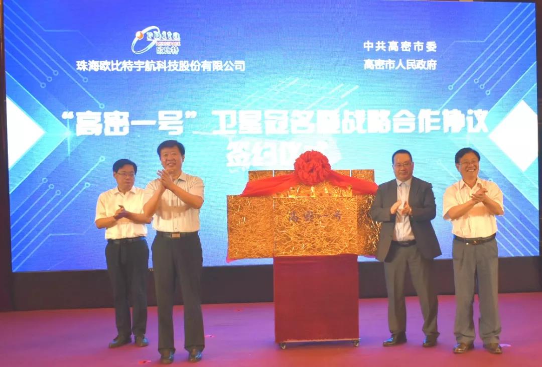 8月17日,“高密一号”卫星冠名暨战略合作协议签约仪式在高密市市会议中心隆重举行,高密市委书记卞汉林,市委副书记、市长王文琦,青岛科技大学党委副书记李庆领,珠海欧比特宇航科技股份有限公司董事长颜军出席并共同为“高密一号”卫星模型揭幕,三方均表示将利用好“高密一号”卫星数据资源,共同促进高密市经济发展。