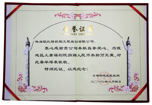 2012年8月4日,带着对西藏人民的深情,珠海欧比特公司赴日喀则地区儿童福利院进行“献爱心”捐赠,共捐赠30万元人民币,以资鼓励日喀则儿童福利院教育事业。 日喀则市民政局党委书记拉巴平措献上了洁白的哈达,儿童福利院院长米玛仓决及全体师生被公司的善...