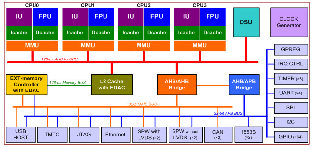 S698PM芯片内部集成4个相同的高性能处理器核心,每个处理器核心均由32位RISC整型处理单元(IU)、双精度浮点处理单元(FPU)、高速一级缓存(L1 Cache)和存储器管理单元(MMU)等组成。