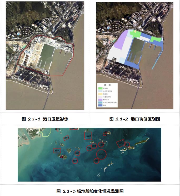 按照《港口工程建设管理规定》(交通运输部令2019年第32号)要求,省级交通运输主管部门、所在地港口行政管理部门应当利用在线平台进行在线监测、协同监管,提高信息化管理水平。为加强和规范港口管理和指导工作,推进港口污染防治工作,港口监测专题利用卫星影像数据生产港口数字正射影像图(DOM)和功能区划图,亦可监测港口锚地内的船舶变化情况。