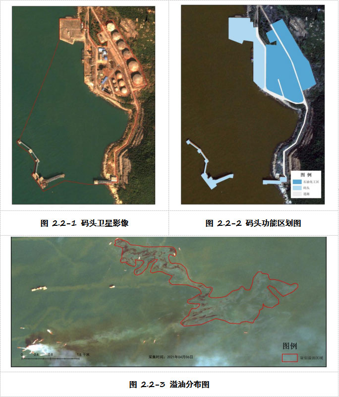 依照《中华人民共和国海洋环境保护法》、《港口危险货物集中区域安全风险评估指南》等要求,海事行政主管部门负责所辖港区水域内非军事船舶和港区水域外非渔业、非军事船舶污染海洋环境的监督管理,并负责污染事故的调查处理,做好港口危险货物集中区域安全风险评估工作,进一步有效控制和降低区域重大安全风险,防范和遏制重特大安全生产事故发生,评估集中区域地理位置及周边环境、总体布局、应急能力等,码头附近水域船舶溢油监测专题利用高空间分辨率影像数据生产数字正射影像图(DOM)、功能区划图,并监测周边发生船舶溢油水域。